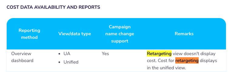 <mark style="color:red;">**Note**</mark><mark style="color:red;">:</mark> The **Retargeting View** in the **Overview Dashboard** does **not** display cost data. The cost for retargeting is available in the **Unified View**.